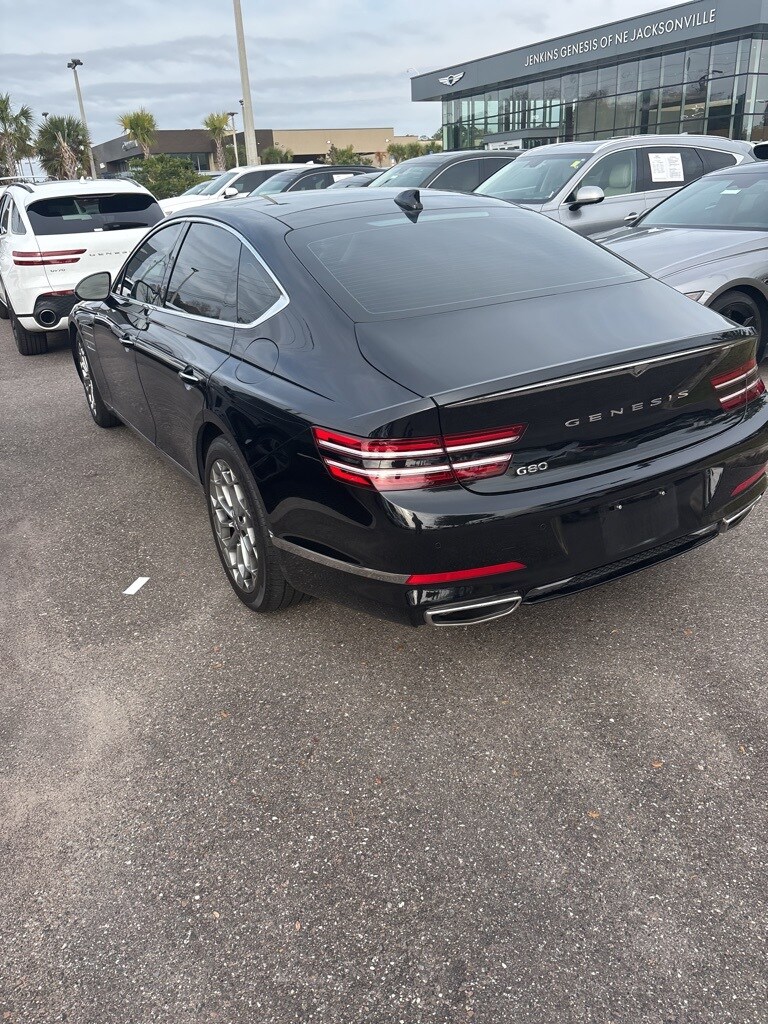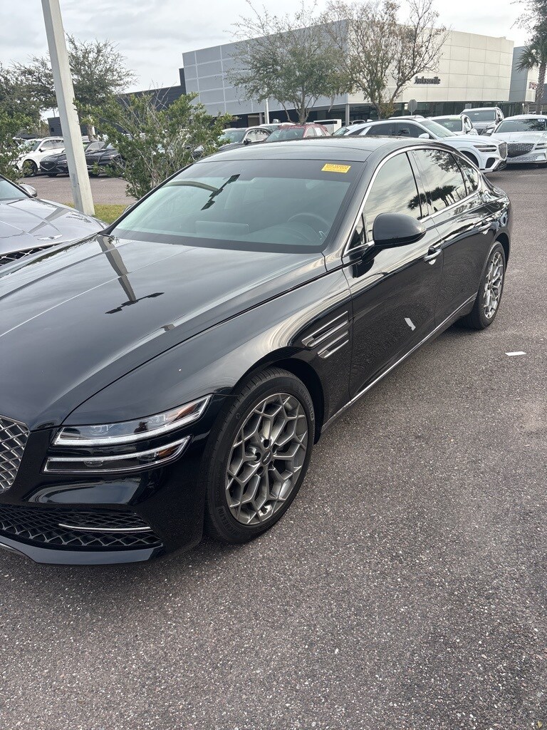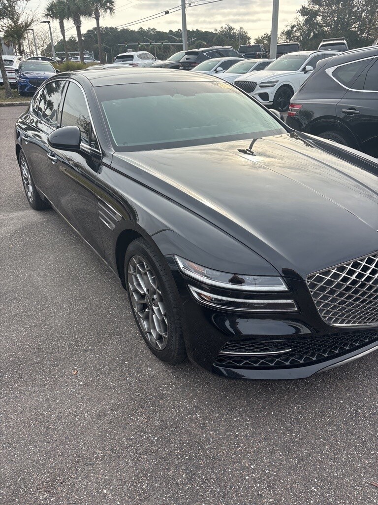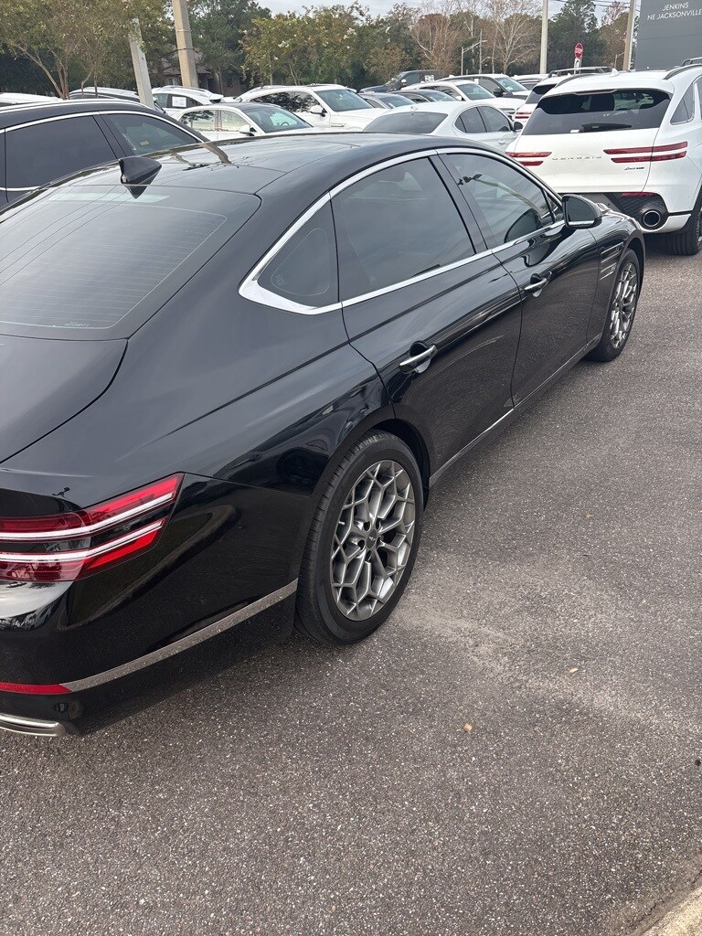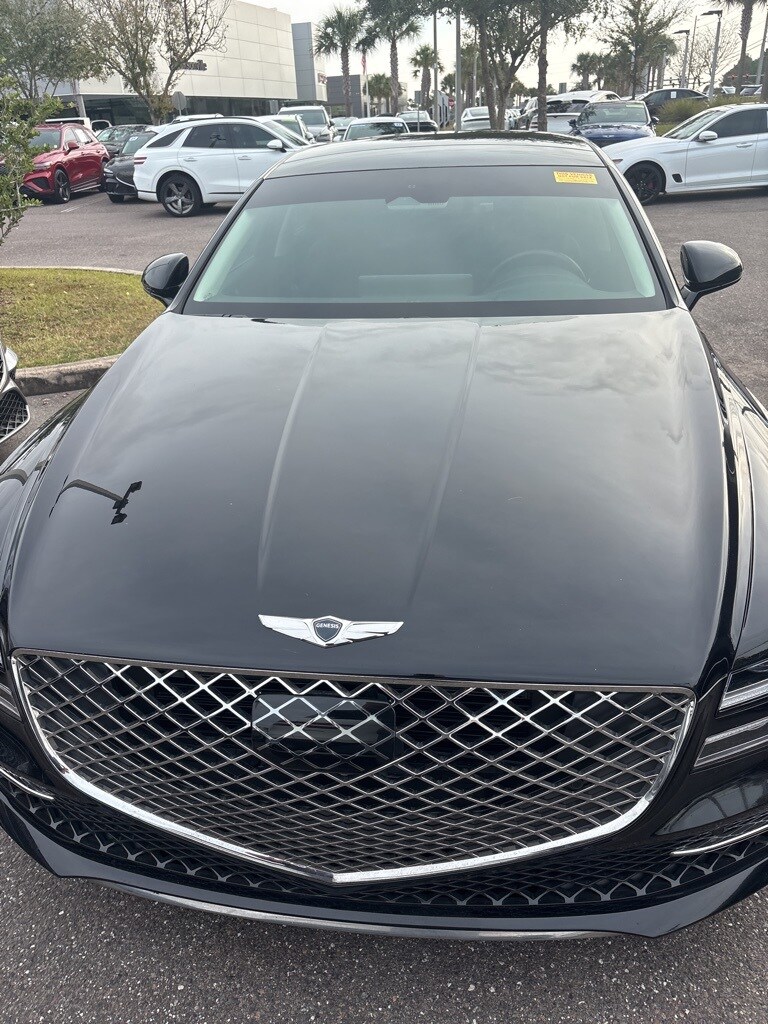 This vehicle comes equipped with Advanced Package, 12 Speakers, 4-Wheel Disc Brakes, ABS brakes, Air Conditioning, Alloy wheels, AM/FM radio: SiriusXM, Android Auto & Apple CarPlay, Anti-whiplash front head restraints, Auto High-beam Headlights, Auto tilt-away steering wheel, Auto-dimming door mirrors, Auto-dimming Rear-View mirror, Automatic temperature control, Bumpers: body-color, Compass, Delay-off headlights, Driver door bin, Driver vanity mirror, Dual front impact airbags, Dual front side impact airbags, Electronic Stability Control, Emergency communication system: Genesis Connected Services, Exterior Parking Camera Rear, First Aid Kit, Four wheel independent suspension, Front anti-roll bar, Front Bucket Seats, Front Center Armrest, Front dual zone A/C, Front reading lights, Fully automatic headlights, Garage door transmitter: HomeLink, Heated door mirrors, Heated Front Bucket Seats, Heated front seats, Illuminated entry, Knee airbag, Leather steering wheel, Leatherette Seating Surfaces, Low tire pressure warning, Memory seat, Navigation System, Occupant sensing airbag, Outside temperature display, Overhead airbag, Overhead console, Panic alarm, Passenger door bin, Passenger vanity mirror, Power door mirrors, Power driver seat, Power passenger seat, Power steering, Power windows, Radio data system, Radio: AM/FM/HD/SiriusXM Audio System, Rain sensing wipers, Rear anti-roll bar, Rear reading lights, Rear seat center armrest, Rear side impact airbag, Rear window defroster, Remote keyless entry, Security system, Speed control, Speed-sensing steering, Speed-Sensitive Wipers, Steering wheel memory, Steering wheel mounted audio controls, Tachometer, Telescoping steering wheel, Tilt steering wheel, Traction control, Trip computer, Turn signal indicator mirrors, Variably intermittent wipers, Wheel Locks, and Wheels: 18"x8.0J Alloy .