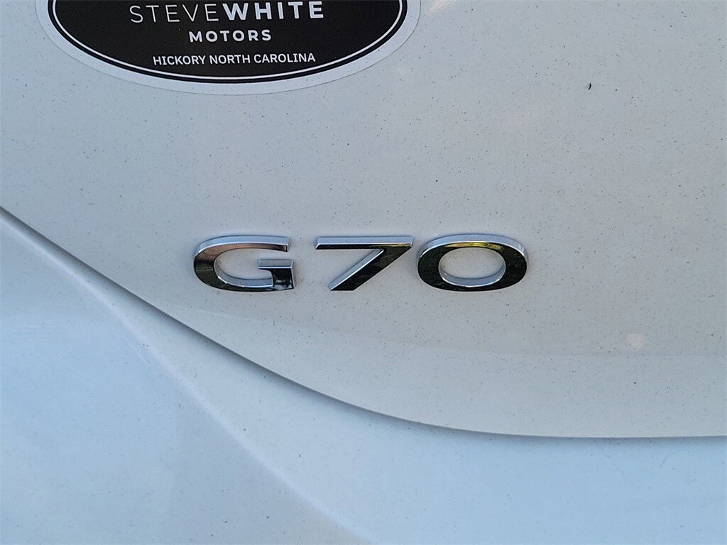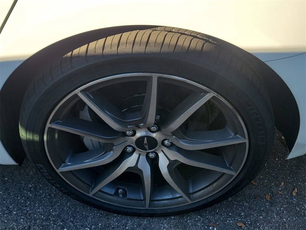 This vehicle comes equipped with Option Group 01, 4-Wheel Disc Brakes, 6 Speakers, ABS brakes, Air Conditioning, Alloy wheels, AM/FM radio: SiriusXM, Android Auto & Apple CarPlay, Anti-whiplash front head restraints, Auto High-beam Headlights, Auto-dimming Rear-View mirror, Automatic temperature control, Brake assist, Bumpers: body-color, Delay-off headlights, Driver door bin, Driver vanity mirror, Dual front impact airbags, Dual front side impact airbags, Electronic Stability Control, Emergency communication system: Genesis Connected Services, Exterior Parking Camera Rear, Four wheel independent suspension, Front anti-roll bar, Front Bucket Seats, Front Center Armrest, Front dual zone A/C, Front reading lights, Fully automatic headlights, Garage door transmitter: HomeLink, Heated door mirrors, Heated front seats, Heated Multi-Adjustable Front Bucket Seats, Heated steering wheel, Illuminated entry, Knee airbag, Leather steering wheel, Leatherette Seating Surfaces, Low tire pressure warning, Navigation System, Occupant sensing airbag, Outside temperature display, Overhead airbag, Overhead console, Panic alarm, Passenger door bin, Passenger vanity mirror, Power door mirrors, Power driver seat, Power passenger seat, Power steering, Power windows, Radio: AM/FM/SiriusXM/HD Audio System, Rear anti-roll bar, Rear reading lights, Rear seat center armrest, Rear side impact airbag, Rear window defroster, Remote keyless entry, Security system, Speed control, Speed-Sensitive Wipers, Split folding rear seat, Steering wheel mounted audio controls, Tachometer, Telescoping steering wheel, Traction control, Trip computer, Turn signal indicator mirrors, Variably intermittent wipers, and Wheels: 19" x 8.0J Fr & 19" x 8.5J Rr Alloy .