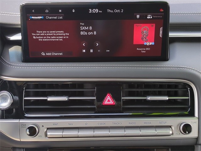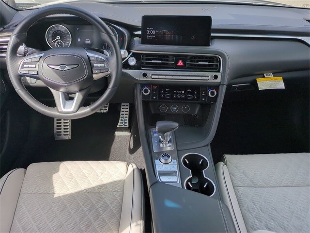 This vehicle comes equipped with Sport Prestige Package, Genesis Certified, 15 Speakers, 4-Wheel Disc Brakes, ABS brakes, Air Conditioning, All Season Fitted Liners, Alloy wheels, AM/FM radio: SiriusXM, Android Auto & Apple CarPlay, Anti-whiplash front head restraints, Auto High-beam Headlights, Auto-dimming door mirrors, Auto-dimming Rear-View mirror, Automatic temperature control, Brake assist, Bumpers: body-color, Delay-off headlights, Driver door bin, Driver vanity mirror, Dual front impact airbags, Dual front side impact airbags, Electronic Stability Control, Emergency communication system: Genesis Connected Services, Exterior Parking Camera Rear, First Aid Kit, Four wheel independent suspension, Front anti-roll bar, Front Bucket Seats, Front Center Armrest, Front dual zone A/C, Front reading lights, Fully automatic headlights, Garage door transmitter: HomeLink, Heated door mirrors, Heated front seats, Htd & Ventilated Multi-Adjustable Fr Bucket Seats, Illuminated entry, Knee airbag, Leather Seating Surfaces, Low tire pressure warning, Memory seat, Navigation System, Occupant sensing airbag, Outside temperature display, Overhead airbag, Overhead console, Panic alarm, Passenger door bin, Passenger vanity mirror, Power door mirrors, Power driver seat, Power moonroof, Power passenger seat, Power steering, Power windows, Radio: AM/FM/SiriusXM/HD Lexicon Prem Audio System, Rain sensing wipers, Rear anti-roll bar, Rear reading lights, Rear seat center armrest, Rear side impact airbag, Rear window defroster, Remote keyless entry, Reversible Cargo Tray, Security system, Speed control, Speed-sensing steering, Speed-Sensitive Wipers, Split folding rear seat, Steering wheel memory, Steering wheel mounted audio controls, Tachometer, Telescoping steering wheel, Traction control, Trip computer, Turn signal indicator mirrors, Variably intermittent wipers, Ventilated front seats, and Wheels: 19" x 8.0J Fr & 19" x 8.5J Rr Sport Alloy .