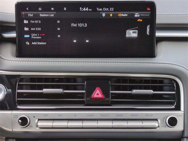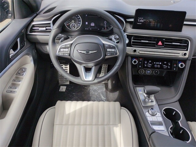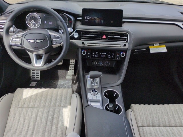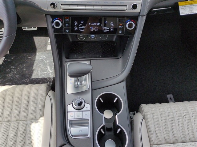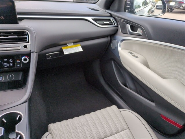 This vehicle comes equipped with Sport Prestige Package (12-Way Power Front Passenger Seat, Acoustic Front Door Glass, Dark Chrome Grille & Daylight Opening Trim, Option Group 02, Power Folding ECM Outside Mirrors, Power Telescoping Steering Wheel, Rain-Sensing Wipers, Sport Aluminum Trim, Ventilated Front Seats, and Wide Sunroof), Genesis Certified, 4-Wheel Disc Brakes, 6 Speakers, ABS brakes, Air Conditioning, Alloy wheels, AM/FM radio: SiriusXM, Android Auto & Apple CarPlay, Anti-whiplash front head restraints, Auto High-beam Headlights, Auto-dimming Rear-View mirror, Automatic temperature control, Brake assist, Bumpers: body-color, Delay-off headlights, Driver door bin, Driver vanity mirror, Dual front impact airbags, Dual front side impact airbags, Electronic Stability Control, Emergency communication system: Genesis Connected Services, Exterior Parking Camera Rear, First Aid Kit, Four wheel independent suspension, Front anti-roll bar, Front Bucket Seats, Front Center Armrest, Front dual zone A/C, Front reading lights, Fully automatic headlights, Garage door transmitter: HomeLink, Heated door mirrors, Heated front seats, Heated Multi-Adjustable Front Bucket Seats, Illuminated entry, Knee airbag, Leatherette Seating Surfaces, Low tire pressure warning, Navigation System, Occupant sensing airbag, Outside temperature display, Overhead airbag, Overhead console, Panic alarm, Passenger door bin, Passenger vanity mirror, Power door mirrors, Power driver seat, Power passenger seat, Power steering, Power windows, Radio: AM/FM/SiriusXM/HD Audio System, Rear anti-roll bar, Rear reading lights, Rear seat center armrest, Rear side impact airbag, Rear window defroster, Remote keyless entry, Reversible Cargo Tray, Roadside Assistance, Security system, Speed control, Speed-Sensitive Wipers, Split folding rear seat, Steering wheel mounted audio controls, Tachometer, Telescoping steering wheel, Traction control, Trip computer, Turn signal indicator mirrors, Variably intermittent wipers, and Wheels: 19" x 8.0J Fr & 19" x 8.5J Rr Alloy .