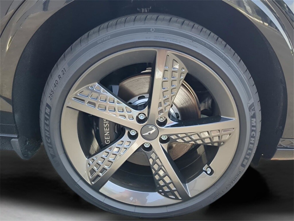 This vehicle comes equipped with Sport Appearance, Sport Prestige Package (12.3" 3D Digital Instrument Cluster, 2nd Row 110V AC Power Outlet, 3-Zone Climate Control, 4-Way Power Lumbar Front Passenger Seat, Adjustable Interior Ambient Lighting, Advanced Rear Occupant Alert, Alloy Pedals, Aluminum Trim w/Haptic Carbon Pattern, Blind-Spot View Monitor, Ergo Motion Seat, Forward Attention Warning, Forward/Reverse Parking Distance Warning, Genesis Digital Key, Heated Steering Wheel, Integrated Memory System (IMS), Leather Seating Surfaces w/Mesh Insert, Leatherette Wrapped Upper Instrument Panel, Lexicon Premium Audio, Manual Rear Door Shades, Option Group 02, Option Group 03, Option Group 04, Passenger Walk-In Device, Power Driver Seat Bolster & Cushion Extension, Power Folding ECM Mirrors w/Genesis Logo Lamp, Power Telescoping Steering Wheel, Power Tilt & Slide Panoramic Sunroof, Remote Smart Parking Assist, Reverse Parking Collision-Avoidance Assist, Surround View Monitor, Ventilated Front Seats, and Wheels: 21" Dark Sputtering Sport Alloy), 4-Wheel Disc Brakes, 9 Speakers, ABS brakes, Air Conditioning, Alloy wheels, Aluminum Trim w/Spin Brushed Pattern, AM/FM radio: SiriusXM, Android Auto & Apple CarPlay, Anti-whiplash front head restraints, Auto High-beam Headlights, Auto-dimming Rear-View mirror, Automatic temperature control, Brake assist, Bumpers: body-color, Cargo Cover, Delay-off headlights, Driver door bin, Driver vanity mirror, Dual front impact airbags, Dual front side impact airbags, Electronic Stability Control, Emergency communication system: Genesis Connected Services, Exterior Parking Camera Rear, First Aid Kit, Four wheel independent suspension, Front anti-roll bar, Front Bucket Seats, Front Center Armrest w/Storage, Front dual zone A/C, Front reading lights, Fully automatic headlights, Garage door transmitter: HomeLink, Heated door mirrors, Heated Front Bucket Seats, Heated front seats, Illuminated Door Scuff Plates, Illuminated entry, Knee airbag, Leather Seating Surfaces, Leather steering wheel, Leatherette Seating Surfaces, Low tire pressure warning, Navigation System, Occupant sensing airbag, Outside temperature display, Overhead airbag, Overhead console, Panic alarm, Passenger door bin, Passenger vanity mirror, Power door mirrors, Power driver seat, Power Liftgate, Power passenger seat, Power steering, Power windows, Radio: 14.5" Navigation System w/AM/FM/HD Radio, Rain sensing wipers, Rear anti-roll bar, Rear Parking Sensors, Rear reading lights, Rear seat center armrest, Rear window defroster, Rear window wiper, Remote keyless entry, Security system, Speed control, Speed-sensing steering, Speed-Sensitive Wipers, Split folding rear seat, Spoiler, Steering wheel mounted audio controls, Tachometer, Telescoping steering wheel, Traction control, Trip computer, Turn signal indicator mirrors, Variably intermittent wipers, Wave Line Backlit Trim, and Wheels: 19" Dark Hyper Silver Alloy .